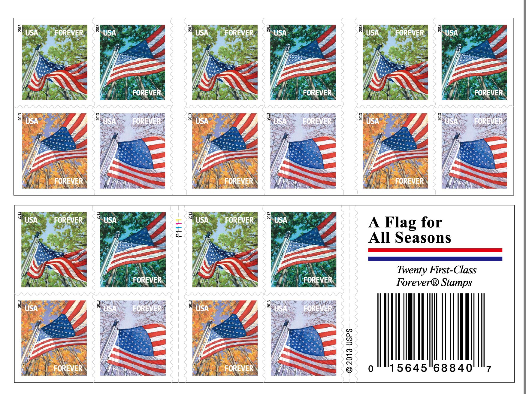 In 2013, the U.S.P.S. added to the long-running U.S. flag series with the Flag for All Seasons issue. Each format features four stamps picturing an American flag flying at the top of a pole. The trees in the background display one of the four seasons on each stamp. Three different printers supplied these stamps and the coil stamps can be identified by their perforations. Order all six sets now with one easy order and save time and money.